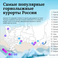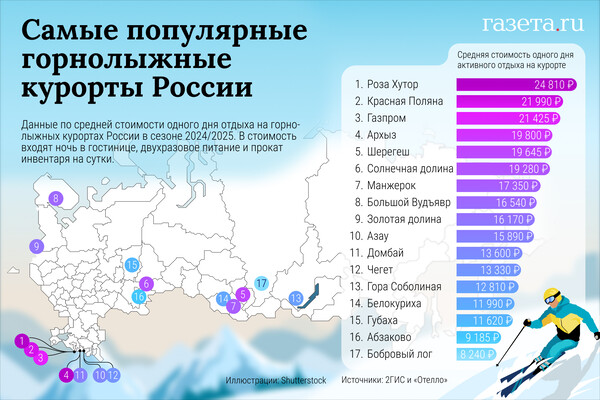 Наиболее бюджетные варианты российских горнолыжных курортов в этом сезоне — в Красноярском крае («Бобровый лог») и Башкортостане (Абзаково). Там день обойдется в 8,2 тыс. и 9,2 тыс. соответственно. А вот рейтинг самых дорогих вариантов возглавил Краснодарский край, где один день будет стоить в среднем 24,8 тыс. («Роза Хутор»), 22 тыс. («Красная поляна») и 21,4 тыс. («Газпром»). Также в список курортов, которые потребуют наиболее значительных бюджетов, вошли Архыз в Карачаево-Черкессии (19,8 тыс.) и Шерегеш в Кемеровской области (19,6 тыс.).