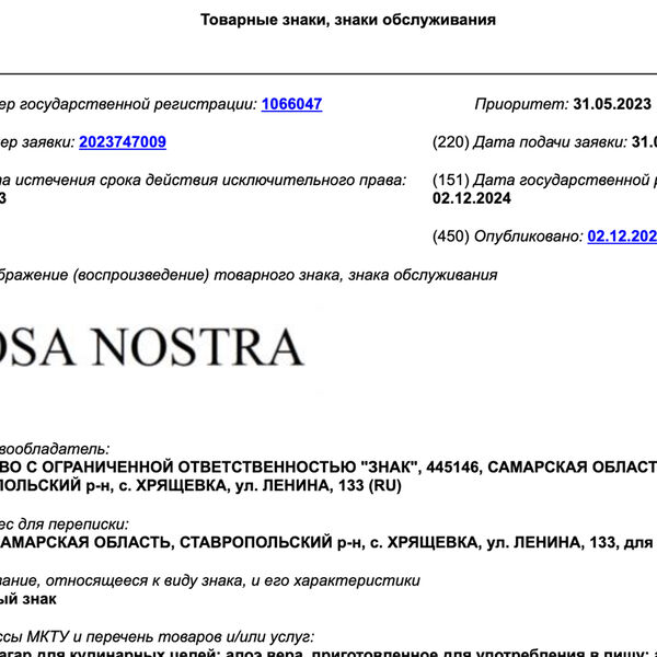 Бренд зарегистрировало ООО «Знак» из села Хрящевка в Самарской области. Заявка была подана 31 мая 2023 года и зарегистрирована 2 декабря 2024 года. Права истекают в 2033 году.