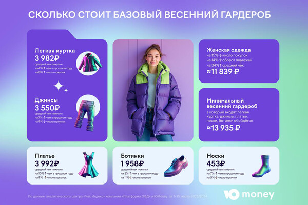 Аналитики кошелька ЮMoney и аналитического центра «Чек Индекс» компании «Платформа ОФД» изучили тренды продаж одежды и выяснили, сколько стоит собрать базовый весенний гардероб. Эксперты проанализировали онлайн- и офлайн-платежи в категории одежды и аксессуаров с 1 по 15 марта 2025 года и сравнили полученные данные с прошлогодними.