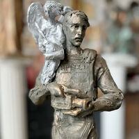Центральной фигурой композиции стал журналист в легком бронежилете, за спиной которого изображен ангел-хранитель.