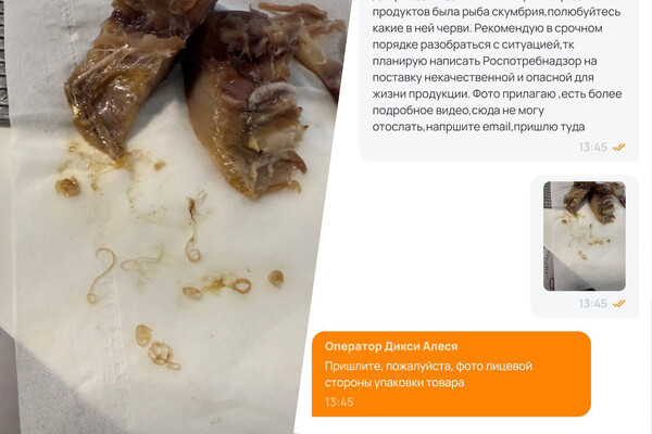 «1 апреля я сделала заказ в приложении «Дикси-доставка». Среди продуктов была «Скумбрия Главрыба» холодного копчения, в которой были обнаружены паразиты «анизакиды». Рыба была упакована в вакуум по кусочкам. Так как упаковка занимает много места, я вскрыла ее и переложила рыбу в чистый стеклянный контейнер, а упаковку выбросила в мусор. Когда стала есть на следующий день, решила вскрыть брюшко кусочка снизу, чтобы проверить, нет ли там паразитов — с рыбой всегда так делаю. Как оказалось, они там были, и не один, а во множественном количестве», — сказала Елена.