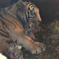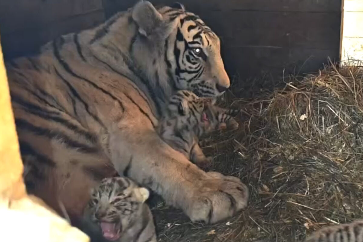 Согласно публикации, пополнение в семье тигров Фифы и Маяка произошло 29 марта. Детеныши весят около не более 1,6 кг, а их длина составляет около 30 см. В первые недели тигрята совершенно беспомощны и зависят от матери. Их глаза закрыты, они ориентируются на голос и запах Фифы. Зрение появится примерно через две недели.