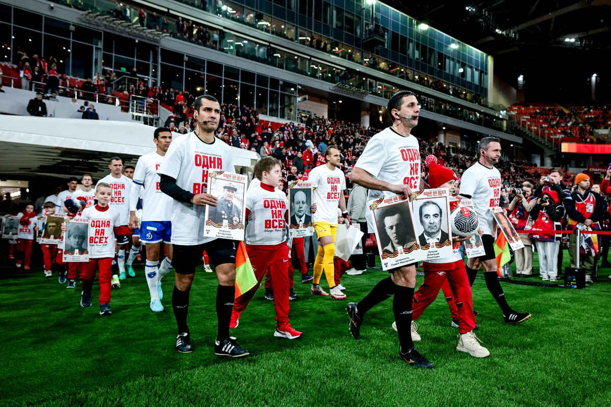 В рамках акции футболисты, арбитры и воспитанники футбольных школ вышли на матч с портретами своих предков, принимавших участие в Великой Отечественной войне.