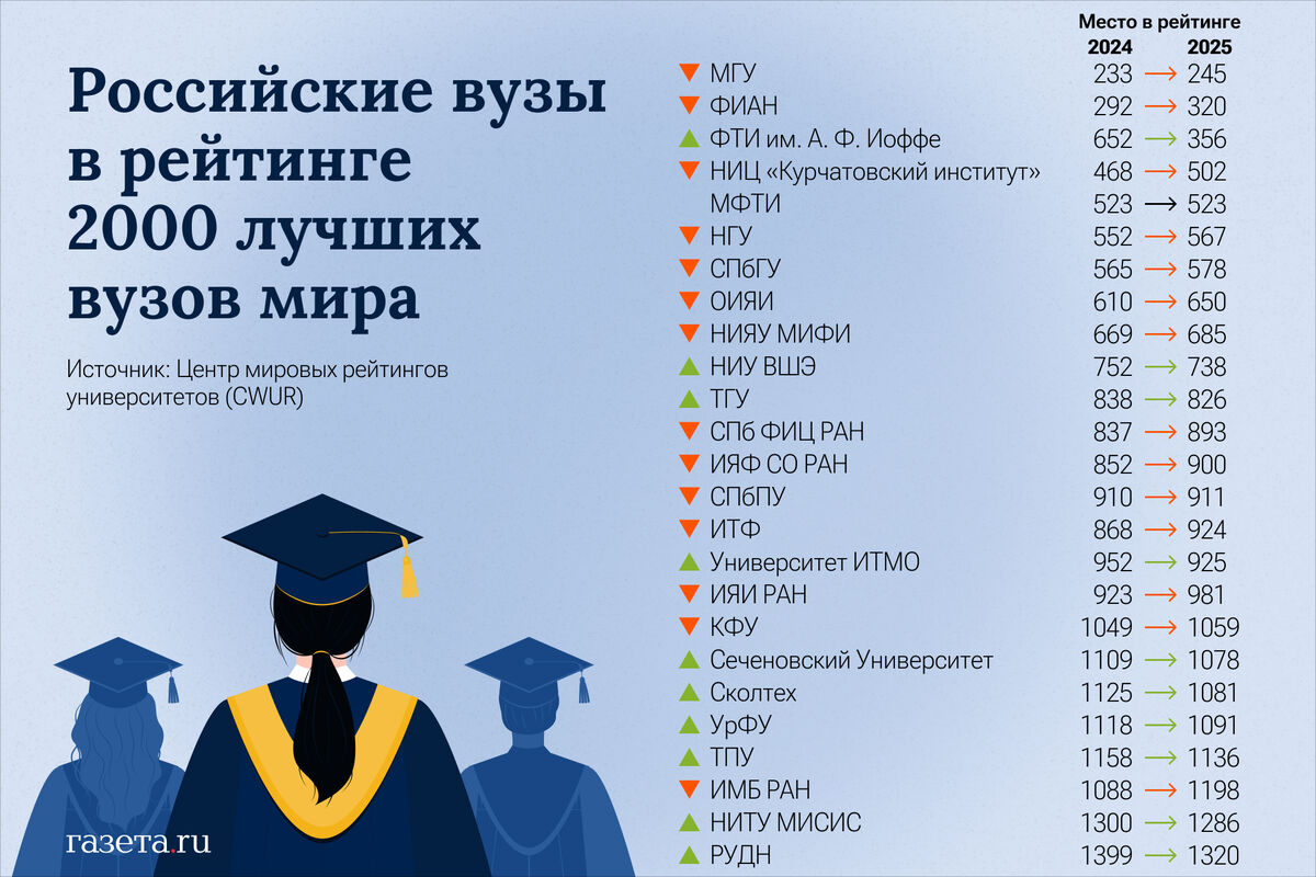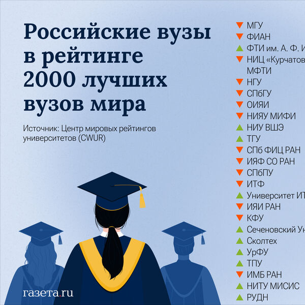В пятерку также вошли Национальный исследовательский центр Курчатовский институт (502, минус 34) и Московский физико-технический институт (523, без изменений).