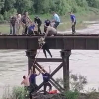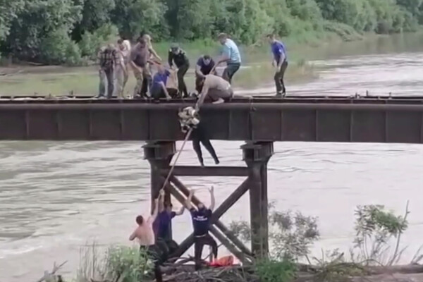 Прибывшие на место ЧП сотрудники МЧС обвязали пенсионерку веревками, затем сплавили ее на завал около аварийного моста и подняли наверх.