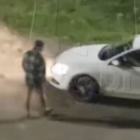 Также на видео попало, как он угрожает напасть на мужчин в гаражах. Те в итоге дали ему отпор, и перейти от слов к делу неадекватный горожанин не решился.
