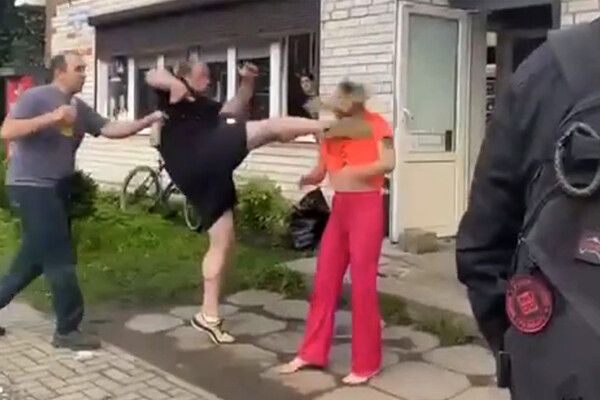 При этом люди рядом какое-то время снимают и только после нескольких ударов пытаются успокоить мужчину. Одному из «защитников» нападавший также нанес удары.