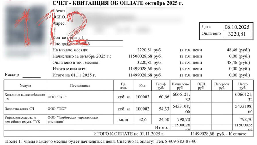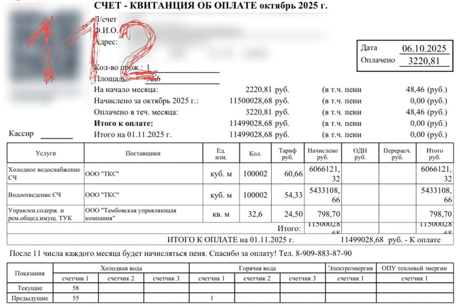 Один из недавних платежных документов оказался неожиданным — в нем указано, что жилье «потребило» около 100 миллионов литров холодной воды. В управляющей компании подтвердили, что разбираются в произошедшем.