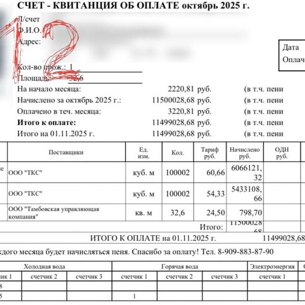 Жительнице поселка под Тамбовом выставили счет за коммунальные услуги на 11,5 млн рублей. Об этом сообщает Telegram-канал 112.