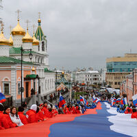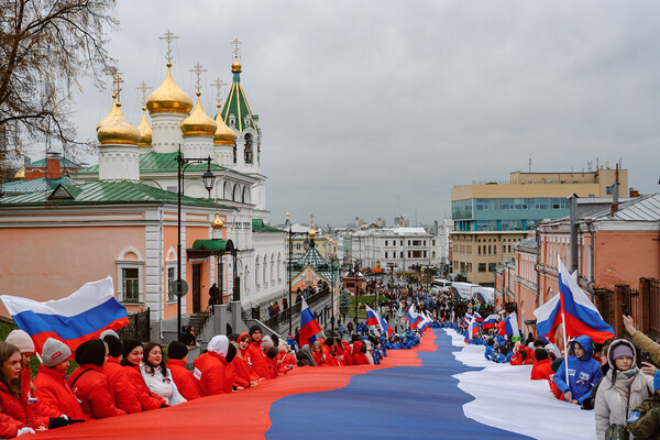 Жители Нижнего Новгорода развернули 100-метровый флаг России на Ивановском съезде у Кремля по случаю Дня народного единства. Об этом сообщает ТАСС.
