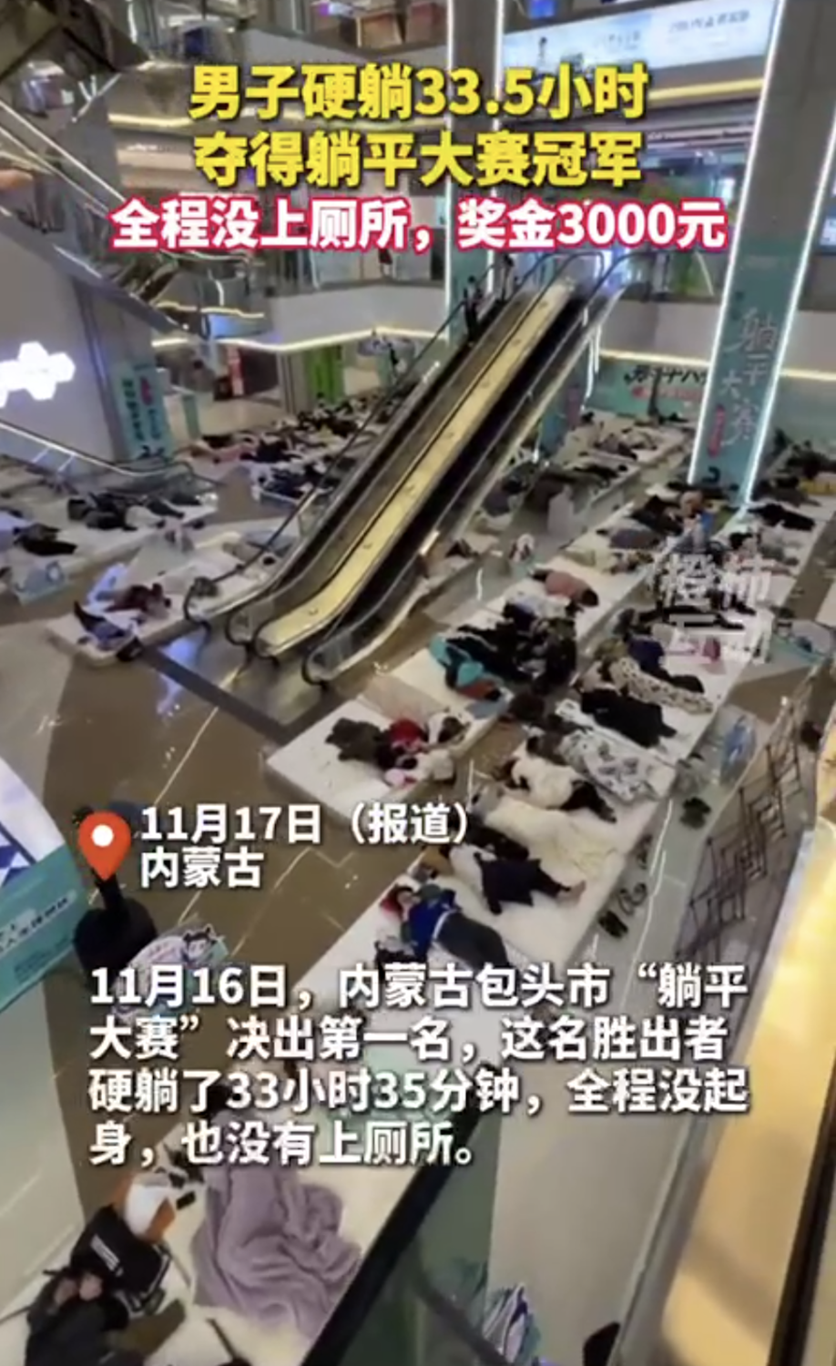 Житель Китая установил рекорд по лежанию на матрасе без вставания на протяжении 33 часов. Мероприятие прошло в одном из торговых центров провинции Внутренняя Монголия, пишет Telegram-канал «Подъем».