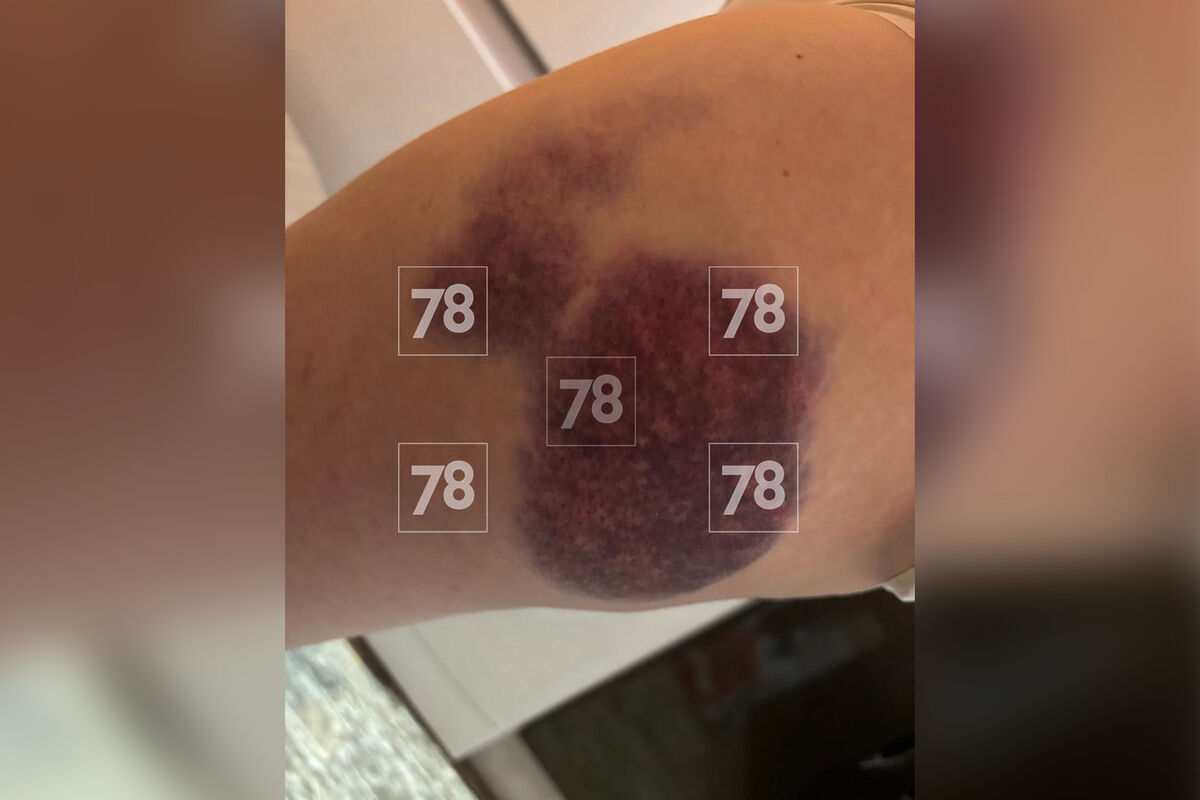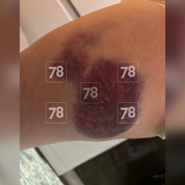 Женщина показала фотографии со своими ушибами. Судя по снимкам, она сильно ушиблась сразу в нескольких местах: большие синяки можно увидеть на лице, руках и ногах.