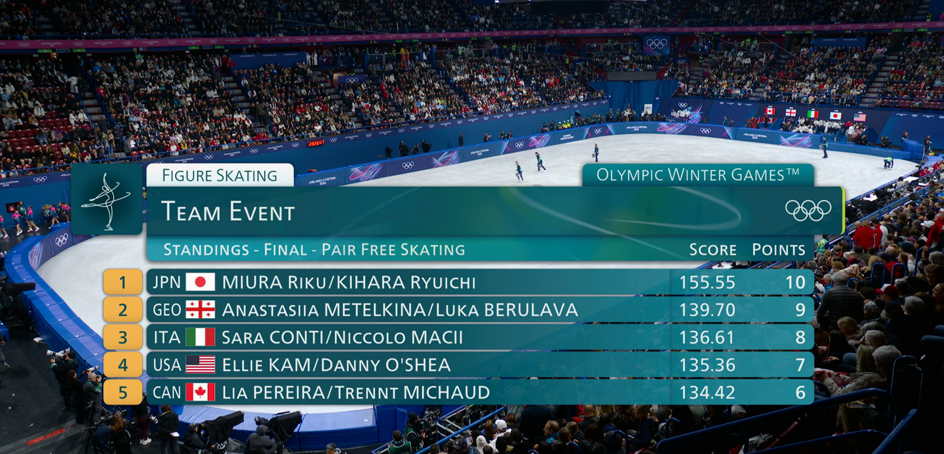 Пары откатали свои произвольные программы, ее результаты на ваших экранах.