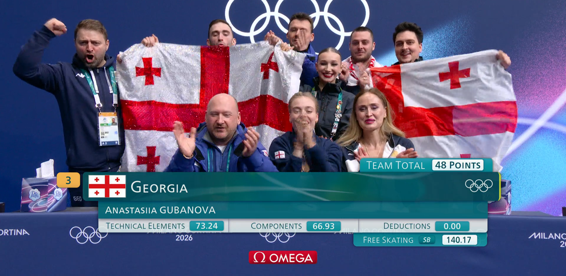 Более 140 баллов набирает за свою произвольную программу под музыку из кинофильма «Привидение» Анастасия Губанова и позволяет оставаться сборной Грузии в борьбе за медали!