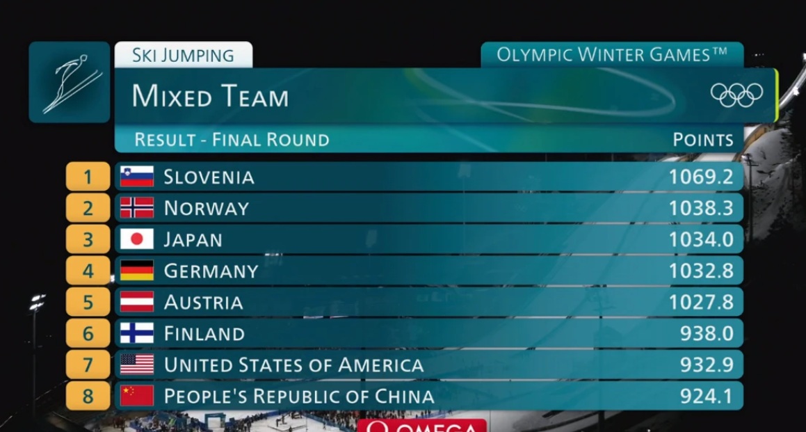 Словенцы победили в прыжках трамплина у смешанных команд. Норвегия и Япония завоевали серебро и бронзу. Германии и Австрии не хватило совсем чуть-чуть.