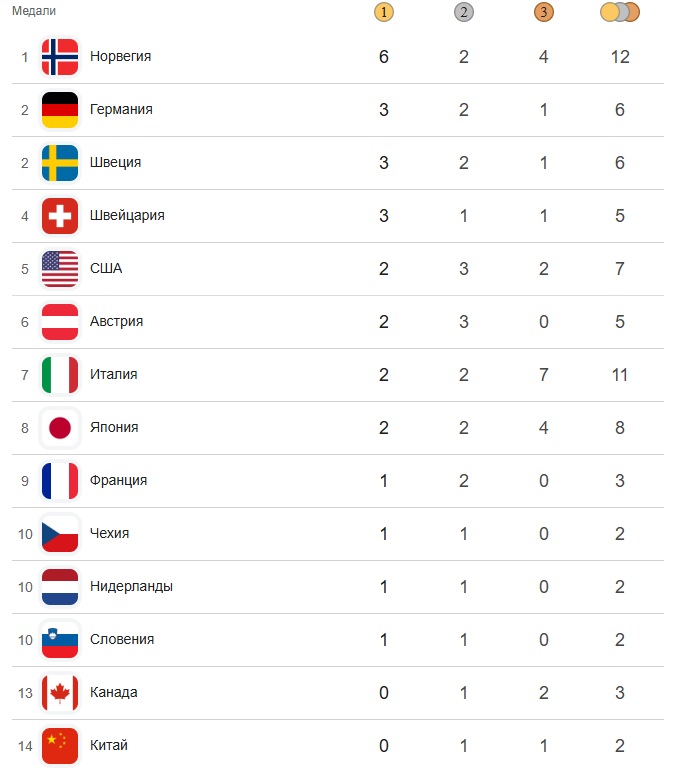 На этом будем прощаться, до завтра. А вот так выглядит медальный зачет Олимпийских игр после четырех дней.