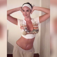 Модель танцует в кроп-топе с глубоким декольте, который обнажает часть ее груди.
