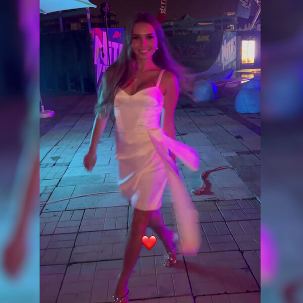 На кадрах спортсменка позирует в белом атласном платье с глубоким декольте, которое обнажает часть груди.