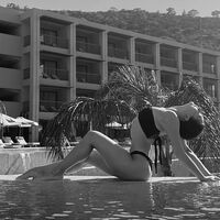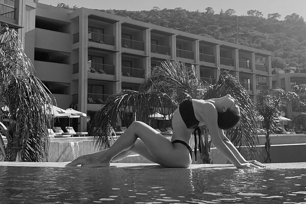 На одном из снимков Крамаренко позирует в купальнике, сидя на краю бассейна. Фотография обработана в черно-белом стиле.