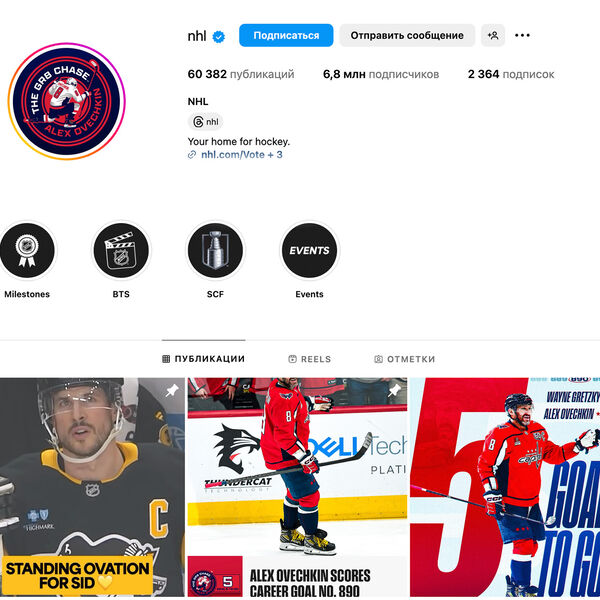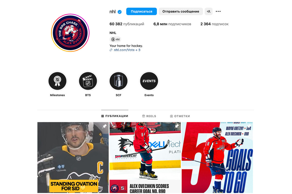 Национальная хоккейная лига (НХЛ) изменила аватарки в своих социальных сетях, посвятив их погоне российского нападающего «Вашингтон Кэпиталз» Александра Овечкина за рекордом канадца Уэйна Гретцки.