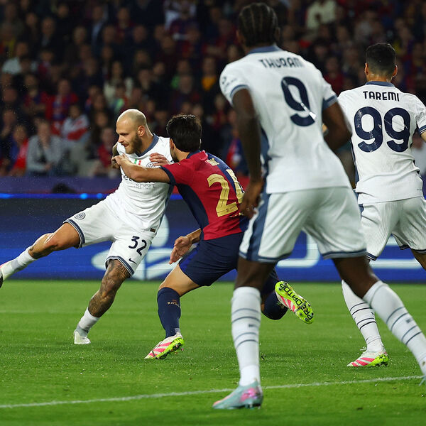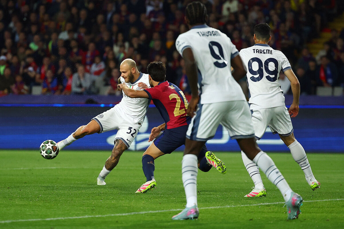 Первая встреча этих команд, которая состоялась на стадионе «Олимпико», завершилась со счетом 3:3. Самый быстрый гол в истории полуфиналов этого турнира забил нападающий «Интера» Маркус Тюрам уже на 30-й секунде. Удвоил преимущество итальянцев Дензел Дюмфрис на 21-й минуте, однако «Барселона» сравняла счет еще до перерыва: на 24-й минуте забил Ламин Ямаль, а на 38-й — Ферран Торрес. На 64-й минуте Дюмфрис оформил дубль, однако уже через минуту автогол на свой счет записал вратарь «Интера» Ян Зоммер.