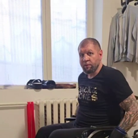 На записи спортсмен, который недавно перенес серьезную операцию, боксирует сидя в инвалидной коляске.