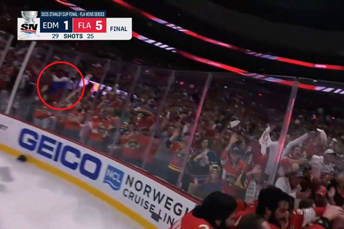 Болельщики принесли на трибуны и растянули российский флаг по ходу шестого матча финальной серии Кубка Стэнли между «Флоридой Пантерз» и «Эдмонтон Ойлерз, передает «Чемпионат».