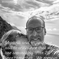 «Мы с Мартиной с грустью сообщаем о расставании после 26 лет совместной жизни. Мы остаемся лучшими друзьями и безмерно гордимся нашими двумя детьми», — написал он, опубликовав фотографию, где супруга целует его в щеку.