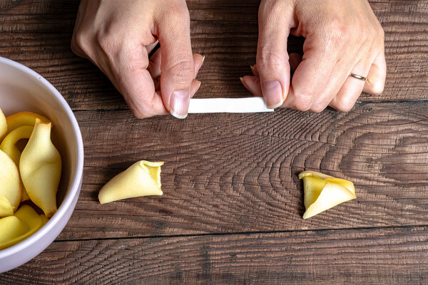 Предсказания на бумажке могут иметь вид китайских печений. Это хрустящие сладости из тонкого теста, в котором спрятаны бумажные полоски с текстом. Печенье можно приготовить самостоятельно или сделать российский вариант — сладкие запеченные орешки. В каждый орешек нужно вложить «пророчество» на грядущий год, соединить половинки и обернуть орешек в разноцветную фольгу, а затем сложить в красивую вазу для печенья.