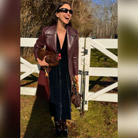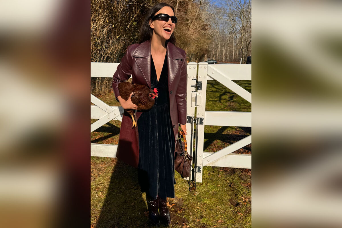 Перед камерой 38-летняя знаменитость предстала в темно-синем бархатном платье-макси с глубоким декольте, поверх которого надела бордовый кожаный тренч с акцентными пуговицами черного цвета. Ирина Шейк добавила к образу темные лаковые ботильоны, винтажную сумку Gucci с монограммой бренда и черные солнцезащитные очки. Модель стояла на ферме и держала в руках курицу. Звезда распустила волосы и сделала нюдовый макияж.