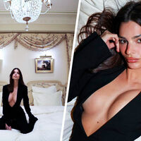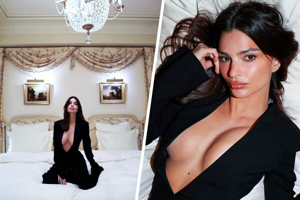 Эмили Ратаковски позировала в черном платье с декольте до живота. Модель сначала вышла на публику, а затем снялась в этом образе на кровати. Ей также выпрямили волосы и сделали макияж с персиковым блеском.