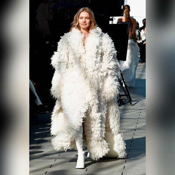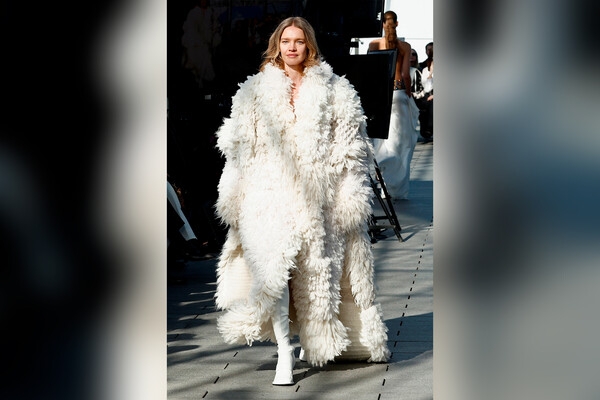 Стелла Маккартни опубликовала фото модели на показе своего бренда. Супермодель прошлась по подиуму в белой объемной шубе из искусственного меха с длинным шлейфом.