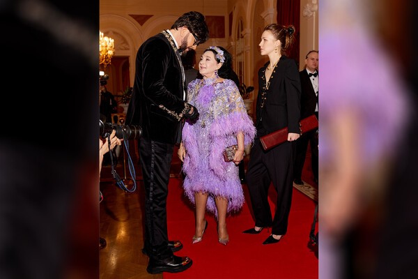 75-летняя Ирина Винер вышла в свет в фиолетовом платье-миди, которое было украшено пайетками и перьями. Она дополнила наряд ободком с цветами в тон, массивными серьгами с лиловыми камнями, цепочкой с кулоном, клатчем со стразами и блестящими туфлями на каблуках розового цвета. Визажисты сделали ей макияж с черными стрелками и нюдовой помадой, а стилисты — объемную укладку. На мероприятии фотографы засняли, как Ирина Винер беседовала с певцом Филиппом Киркоровым.