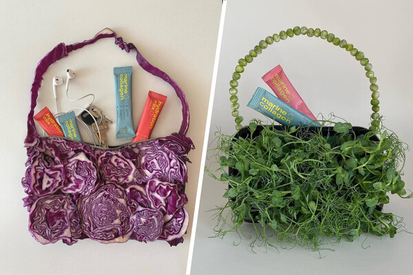 В рекламе бренд показал сумки из капусты, гороха, физалиса, салата и других растений. Изделия наполнили разными пакетиками со смесями для напитков.