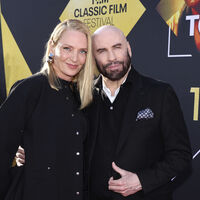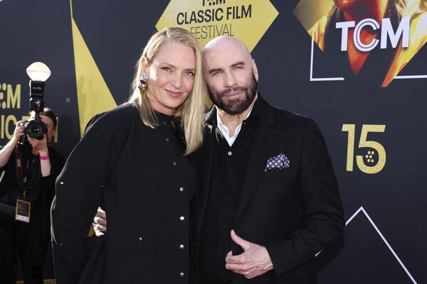 В этот день культовому фильму Квентина Тарантино «Криминальное чтиво» исполнилось 30 лет. Турман, которая сыграла в картине жену босса мафии Мию Уоллес, пришла на мероприятие в облегающем джемпере, элегантном кардигане с металлическими пуговицами и в брюках свободного кроя. Джон Траволта, исполнивший роль наемника Винсента Веги, пришел в белой рубашке, джинсах и жакете.