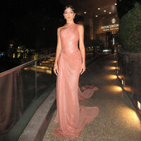 Перед камерой 33-летняя Нюша позировала в бежево-пудровом «голом» платье. Ей сделали ретро укладку с прядями и вечерний макияж с хайлайтером. Образ дополнили браслеты и кольца с бриллиантами. Певица получила премию в номинации «Модный артист года» и поблагодарила жюри за выбор.