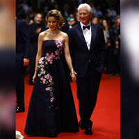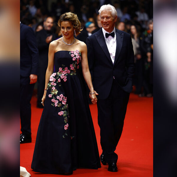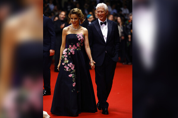 Пара пришла на красную ковровую дорожку в парном черном образе. 74-летний Ричард Гир предпочел черный смокинг с белой рубашкой, а его жена — платье-макси с розовыми цветами.