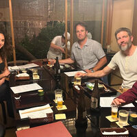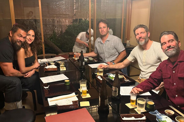 На одном из кадров 44-летний Джейсон Момоа обнимал 32-летнюю Адрию Архону. Знаменитости были запечатлены в кафе. Они сидели за столом с друзьями и улыбались фотографу. Актер позировал в черной футболке и брюках, а девушка — в облегающем платье.