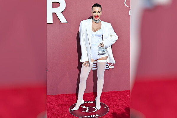 Модель позировала в корсетном боди, трусах с завышенной линией талии и жакете с мужского плеча. Образ дополнили чулки в тон, блестящая сумка и полупрозрачные туфли на каблуках. Дарья Коновалова также сделала укладку с гладким пучком и макияж с красной помадой.
