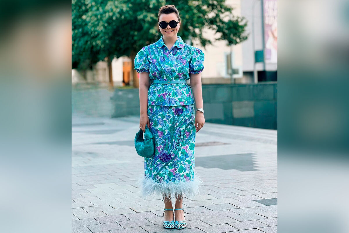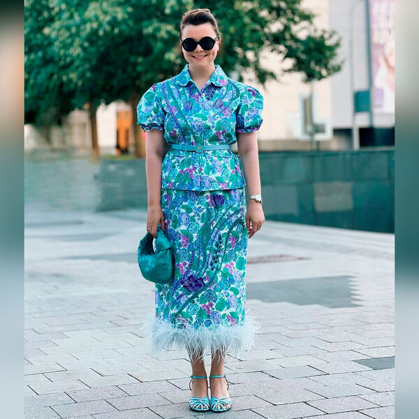 «Молодая жена Петросяна показывает, как интегрировать кричащие перья в повседневные образы. Татьяна продемонстрировала яркий костюм с цветочным притом с юбкой, декорированной голубыми перьями. Образ 35-летняя Брухунова дополнила дорогими аксессуарами — ремнем Christian Dior и сумкой оттенка морской волны от Bottega Veneta», — написала Родина.