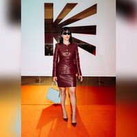 Для выхода на публику Тина Канделаки предпочла кожаный бордовый костюм, состоящий из жакета и юбки. Образ дополнили черные узкие очки. Наряд и аксессуары телеведущей напомнили стиль 90-х годов. Волосы ей уложили в прямое каре и сделали легкий макияж.