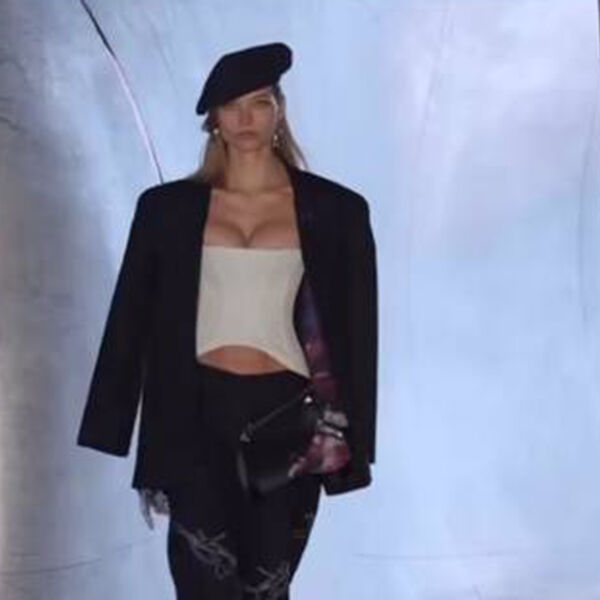 Модель Алеся Кафельникова позировала в белом корсете с глубоким декольте, кожаных брюках и жакете. На голову она надела берет из кожи и дополнила образ массивными золотыми серьгами. Ей также сделали укладку с распущенными волосами и вечерний макияж.
