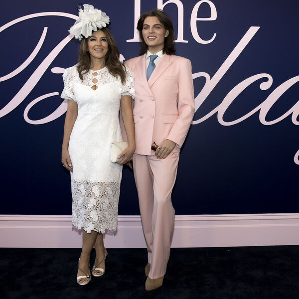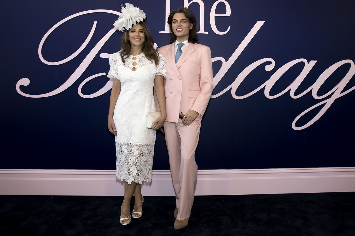 59-летняя Элизабет Херли предпочла для вечера белое платье из кружева, которое дополнила шляпкой и клатчем. Ее сын Дэмиан в розовом позировал в брючном костюме с голубым галстуком.