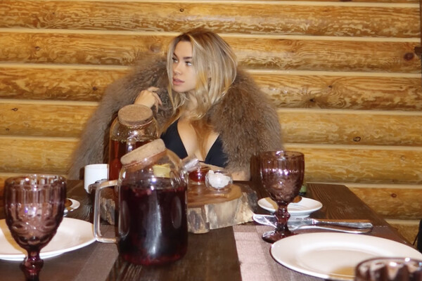 Юлия Власова была запечатлена в черном лифе бикини, поверх которого надела коричневую шубу. Модель позировала с распущенными волосами и без косметики. Манекенщица сидела за столом на фоне медвежьей шкуры.