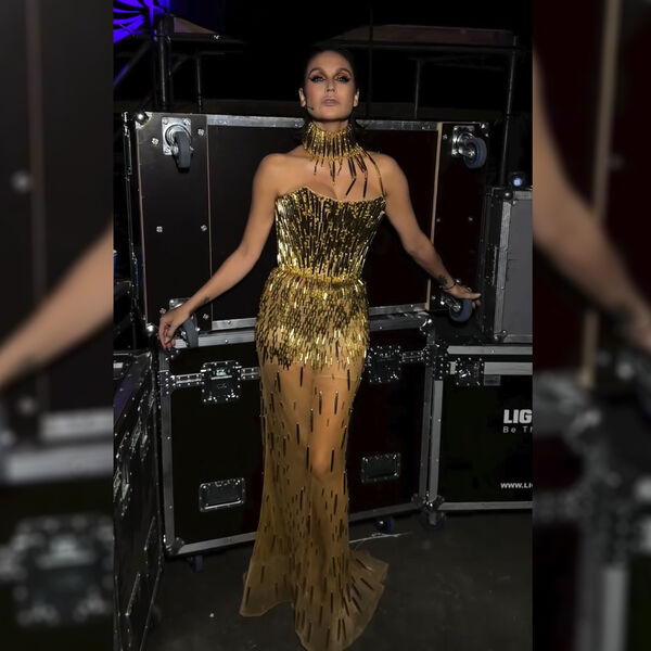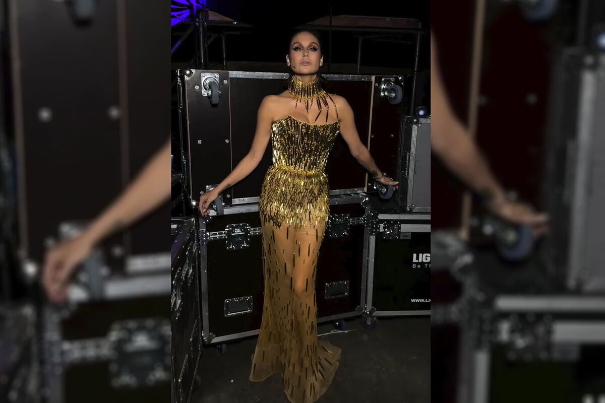 39-летняя Ляйсан Утяшева позировала в наряде авторства дизайнера Валентина Юдашкина 1990 года. Гимнастка была запечатлена в золотом платье-макси с прозрачной юбкой, украшенном пайетками. Визажист сделал телеведущей макияж с блестящими тенями, черными стрелками и розовым блеском для губ, а стилист уложил волосы.