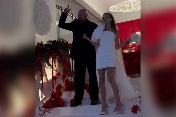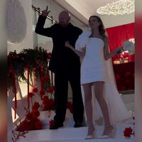 18-летняя Александрина была запечатлена в белом коротком платье-бюстье, которое дополнила длинной фатой и туфлями на каблуках. Девушке уложили волосы в локоны. 49-летний Марк Горобец предпочел для торжества черный брючный костюм, рубашку и туфли. В ролике влюбленные танцевали на лестнице.