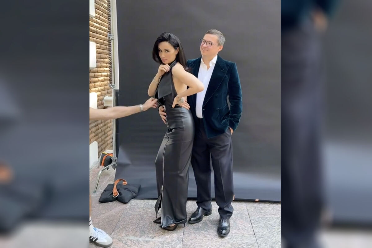 49-летняя Тина Канделаки позировала в сером струящемся платье с открытой спиной и высоким горлом. Образ дополнили туфли на высоких каблуках и с острым мысом. Волосы ей уложили мягкими прядями и сделали вечерний макияж. В кадре она позировала вместе с мужем Василием Бровко.