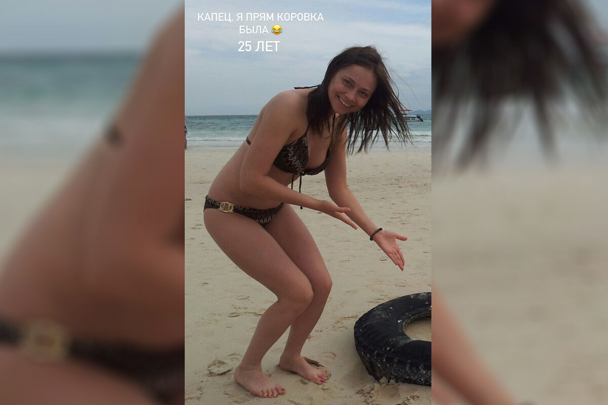 Настасья Самбурская была запечатлена в коричневом бикини с принтом и золотым украшением на пляже. Актриса позировала с распущенными волосами и без макияжа. Звезда сериала «Универ» не оценила свой внешний вид в 25 лет.