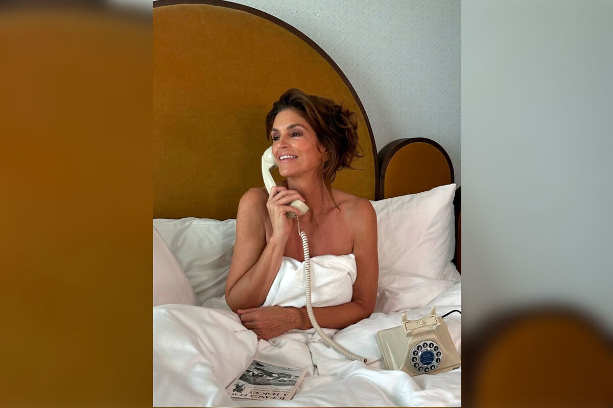 59-летняя Синди Кроуфорд предстала перед камерой без одежды, укрывшись одеялом. Супермодель была запечатлена с собранными волосами и макияжем с темными тенями. Звезда подиумов сидела на кровати с телефонной трубкой в руках.