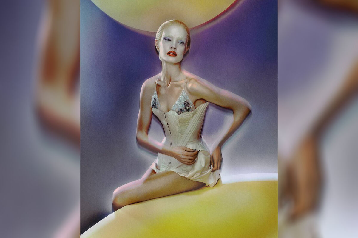 42-летняя Наталья Водянова сменила несколько образов: корсетном мини-платье, черной рубашке, красном платье и не только. На одном из них модель лежала в атласных лентах. Ей также сделали театральный макияж с белым тоном, красной помадой, голубыми тенями и закрашиваем бровей.